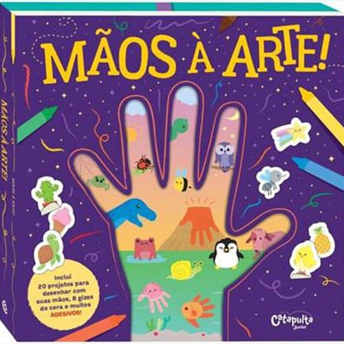 Mãos à Arte! Tudo que você precisa para desenhar com as mãos, você encontra neste livro. Sabia que você pode traçar o contorno de sua mão e transformá-lo em uma galinha, um gato, uma água-viva ou no que quiser? É muito fácil e divertido, siga as dicas e complete seu desenho com os adesivos. Inclui: 20 projetos para desenhar com suas mãos, 8 gizes de cera e 3 folhas de adesivos.