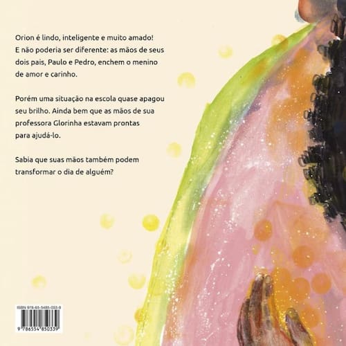 Com a ajuda de sua professora Glorinha e de seus pais, Paulo e Pedro, Orion faz uma grande descoberta: o poder de suas mãos pode transformar o mundo! Orion é um menino alegre, inteligente e muito amado pelos pais Paulo e Pedro. As mãos deles o encheram de carinho desde o primeiro abraço em um orfanato. Em todas as situações, eram essas mãos que o orientavam e o apoiavam. Um dia, a professora de Orion, dona Glorinha, sugeriu aos alunos que fizessem um trabalho escolar, e ele, animado, escolheu as mãos para tema de sua pesquisa. Porém, antes da apresentação, o menino foi surpreendido por comentários maldosos sobre sua família. Foi nesse momento que ele precisou encontrar, dentro de si, todo o amor e afeto recebido pelas mãos de seus pais e pela professora para construir sua confiança, autoestima e superar o preconceito. Uma história surpreendente de Kiusam de Oliveira e lindamente ilustrada por Natália Gregorini sobre a importância do amor nas relações como forma de combate à intolerância. Indicado para leitores a partir de 9 anos.