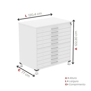Possui 10 gavetas amplas com corrediças que facilitam a abertura, mesmo com carga total.