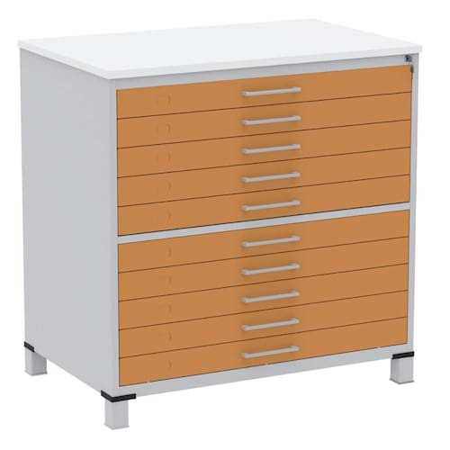 Mapoteca 10 Gavetas Pandin 120 cm (Larg) Inmetro Tampo MDP Branco Estrutura Aço Cinza Gaveta Laranja