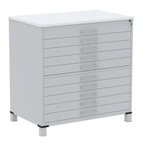 Fabricada com chapa de aço resistente, a mapoteca de aço galvanizado foi desenvolvida com um processo de tratamento anticorrosivo de nanotecnologia e pintada com tinta híbrida eletrostática para maior durabilidade. Com chapas mistas de aço #22 (0,75mm), #24 (0,60mm) e tampo em MDP de 25mm, garante robustez e eficiência perfeitas para espaços de trabalho que necessitam de armazenamento especializado.