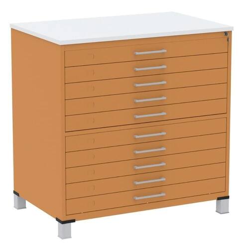 Mapoteca 10 Gavetas Pandin 120 Cm (larg) Inmetro Tampo Mdp Branco Estrutura E Gavetas Em Aço Laranja