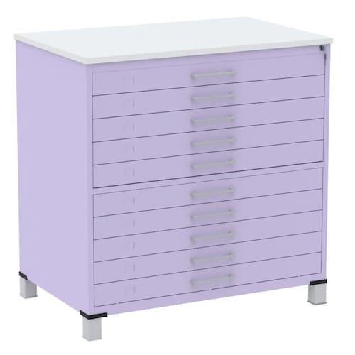 Mapoteca 10 Gavetas Pandin 120 cm (Larg) Inmetro Tampo MDP Branco Estrutura e Gavetas em Aço Lilás - Cinza
