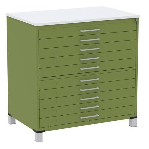 Mapoteca 10 Gavetas Pandin 120 Cm (larg) Inmetro Tampo Mdp Branco Estrutura E Gavetas Em Aço Verde