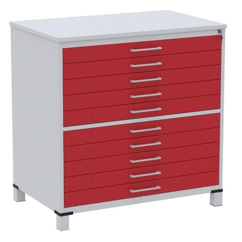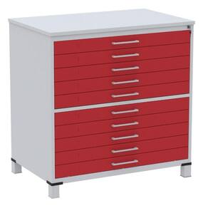 Mapoteca 10 Gavetas Pandin 120 cm (Larg) Inmetro Tampo MDP Cinza Estrutura Aço Cinza Gaveta Vermelha - Vermelho