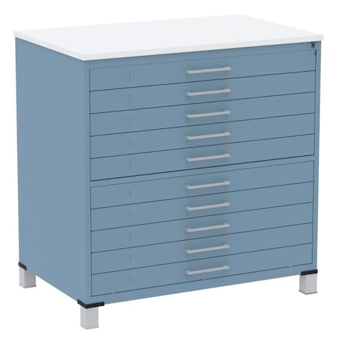 Mapoteca 10 Gavetas Pandin 120cm (Larg) Inmetro Tampo MDP Branco Estrutura e Gaveta em Aço Azul Dali - Cinza