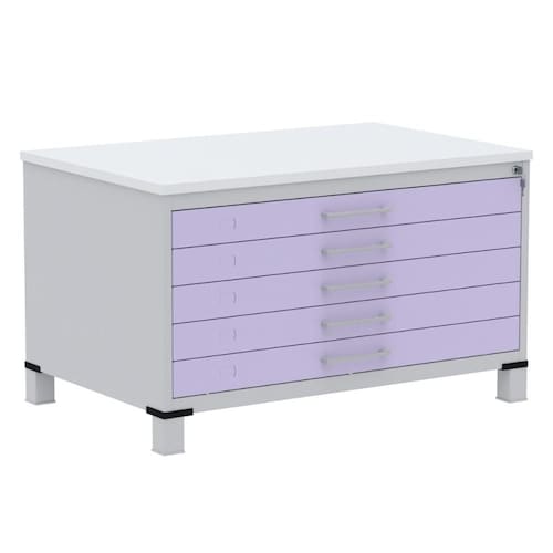 Mapoteca 5 Gavetas Pandin 120 cm (Larg) Inmetro Tampo MDP Branco Estrutura Aço Cinza Gavetas Lilás