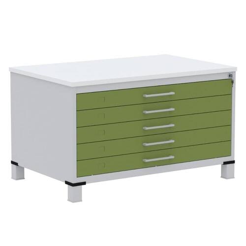Mapoteca 5 Gavetas Pandin 120 Cm (larg) Inmetro Tampo Mdp Branco Estrutura Aço Cinza Gavetas Verdes