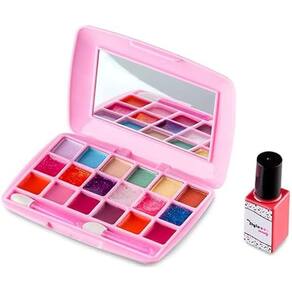 Idade sugerida: +5 anos Conteúdo: 6 tons de sombras, 6 cores de blush cremoso, 6 lindas cores de gloss labial para se maquiar e ainda 1 esmalte para unhas e 2 pinceis