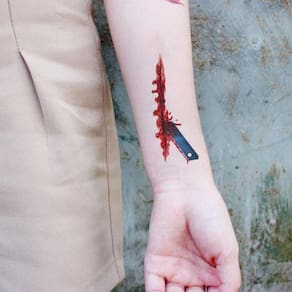 Prótese de látex para simular ferida com 1 corte grade de 13cm + látex 10 ml para colar + sangue líquido falso 10ml Pinte a prótese com bases específicas. Aplicação: