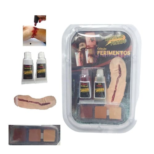 Maquiagem terror para halloween sangue falso ferida grande Maquiagem para halloween kit com sangue, cola e molde de corte grande - rostinho pintado