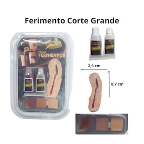Maquiagem para halloween ferimentos - corte grande - 1 unidade Ideal para festas, teatro, simulações de acidentes, carnaval, halloween, use sua criatividade sem limites, a maquiagem de ferimentos pode te deixar irreconhecível para seus amigos Modo de uso: 1 - aplique um pouco de cola sobre a pele na região do corpo onde deseja colar as próteses e espere secar por alguns segundos. 2 - em seguida coloque a prótese sobre a cola com a parte da ferida para cima e aguarde mais 1 minuto aproximadamente. 3 - após secagem, aplique a maquiagem com o tom de pele de sua preferência e finalize colocando o sange falso na quantidade que desejar. 4 - sua prótese já está pronta agora é só curtir a festa.