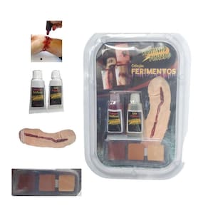 Maquiagem para halloween ferimentos - corte grande - 1 unidade Ideal para festas, teatro, simulações de acidentes, carnaval, halloween, use sua criatividade sem limites, a maquiagem de ferimentos pode te deixar irreconhecível para seus amigos Modo de uso: 1 - aplique um pouco de cola sobre a pele na região do corpo onde deseja colar as próteses e espere secar por alguns segundos. 2 - em seguida coloque a prótese sobre a cola com a parte da ferida para cima e aguarde mais 1 minuto aproximadamente. 3 - após secagem, aplique a maquiagem com o tom de pele de sua preferência e finalize colocando o sange falso na quantidade que desejar. 4 - sua prótese já está pronta agora é só curtir a festa.