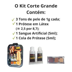 Neste kit contêm: - 1 tubo de cola 5 ml - 1 tubo de sangue 5 ml - 1 prótese em látex - 1 conjunto tons de pele 1g cada