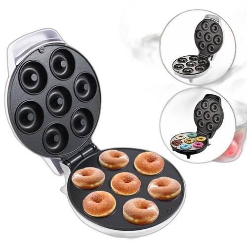Máquina para fazer donuts e rosquinhas. Faz 7 donuts de cada vez, é antiaderente, aquecimento de dupla face para um cozimento uniforme. Tempo de cozimento: 0-5 minutos. Usos: família, festa, confeitaria, chá de leite, padaria.Chapa antiaderente