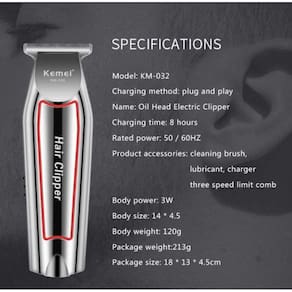 Máquina de Acabamento barba e cabelo Profissional kemei KM-032- Acompanha 3 pentes guia tamanhos 1mm/2mm/3mm, para você já receber e começar a praticar seus cortes - Totalmente recarregável em rede elétrica 110 ou 220v, acompanha cabo de força.- 8 Horas de carga para 1 hora de uso.- Potência: 3W- Frequência: 50/60HzItens inclusos:- 1 Máquina KM-032- 1 Cabo de força- 3 Pentes Guia- 1 Óleo Lubrificante- 1 Escova para Limpeza