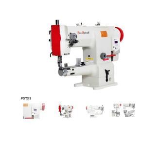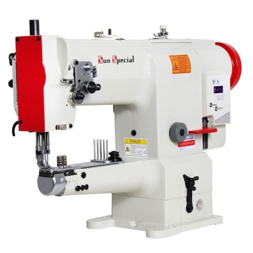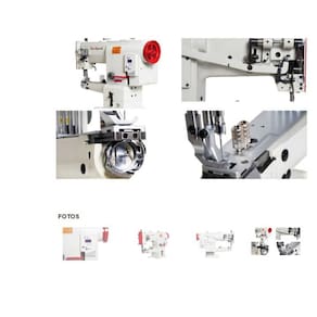 Máquina de costura industrial com transporte triplo, braço, 1 agulha, motor Direct Drive, controle de velocidade, material extra pesado, lubrificação automática e pavio, lançadeira grande rotativa, diâmetro do braço de 50mm, altura do calcador de 6mm, comprimento do ponto de 8mm, tipo de agulha DPx17.Funções