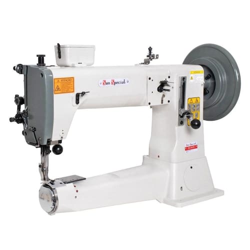 Máquina de braço transporte triplo para materiais pesados e linha grossa. Base cilíndrica com lançadeira grande especial para costuras muito grossas até 2 cm de grossura. Sistema de triple arraste para tecidos difíceis, grossos e duros. Mecanismo remate pneumático automático de série. Pode costurar com linhas grossas até 8/3 e utilizar agulha até 280.Funções