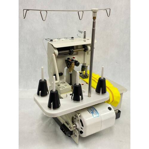 Máquina de costura galoneira 4 fios portátil. Utilizada para barras, bainhas, debrum (viés) e rebatimento de elástico em tecidos leves.