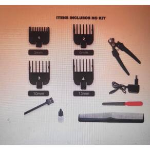 1x Professional Pet clipper máquina. 4 Pentes plásticos niveladores do corte nº 1, 2, 3 e 4 sendo de tamanhos 3mm, 6mm, 10mm e 13 mm 1x Cortador de unhas e lixa 1x Pente plástico 1x Escova da lâmina 1x frasco c/ óleo lubrificante 1x manual de uso 1x Carregador de bateria Marca: Novavida