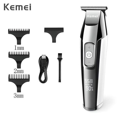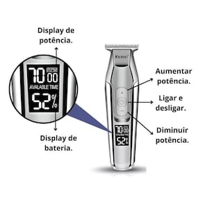 Máquina de cortar cabelo e aparar pelos kemei km-5027 100v/220v prata originala kemei km-5027 pode ser utilizada tanto como uma máquina de acabamento ou aparador de pelos, é bem potente e se diferencia dos outros modelos. Essa em especial tem botões de ajuste de rotação do motor na parte frontal, você pode ajustar para cortar mais rápido ou devagar. Pode-se visualizar qual rotação está escolhida no visor da máquina.A bateria deste modelo tem uma autonomia de 120 minutos de uso, na parte frontal possui um visor que informa quantidade de carga na máquina. É recarregável tanto em entrada usb ou tomada 110/220v, esse modelo acompanha o cabo usb e a fonte bivolt. Você escolhe como carregar, qual forma mais lhe convém.O motor possui 5w e é bem potente, aguenta o trabalho do dia a dia se você pretende usar profissionalmente, esse modelo fez muito sucesso entre os meus clientes por ser uma máquina bonita, completa e que dificilmente apresenta problemas.Pode ser utilizada também como aparador de barba, pessoalmente uso uma dessa para raspar em baixo da barba e fazer a linha da barba, a lâmina dela tira muito bem sem precisar ficar passando direto.Especificações técnicas :- tamanho dos pentes : 1mm ,2mm ,3mm- potência motor : 5w- tempo de recarga : 2:00h- tempo de uso : 270minitens inclusos- máquina- cabo usb- fonte bivolt- 3 pentes guias- óleo lubrificante- escovinha de limpeza seja bem vindo a à gallus shop somos uma loja especializada em market place desde 2020, com um histórico de mais de 20 mil clientes satisfeitos nesse período. E agora, com diversos produtos eletrônicos e de utilidades diárias. Com a missão de atender com responsabilidade nossos clientes de todo o brasil, faremos da sua compra em nossa loja, uma incrível experiência que nossa qualificada equipe é capaz de proporcionar. Prezamos sempre por qualidade, envios ágeis e por um ótimo e rápido atendimento Marca: Kemei 5027