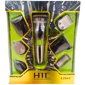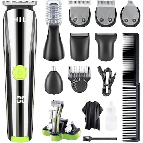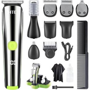 Inclui 4 pentes guias: 3, 6, 9 e 12 mm - 5 aparadores: cabelo, barba, bigode, para nariz e orelhas e de precisão - Cabo de alimentação - Base carregadora - Escova de limpeza - Óleo lubrificante - Pente de barbeiro - Protetor da lâmina - Manual