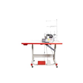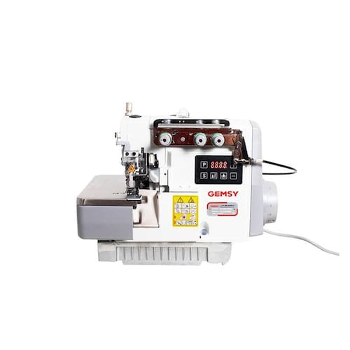 Máquina de costura industrial overlock eletrônica para confecção de vestuário com tecidos leves e médios.