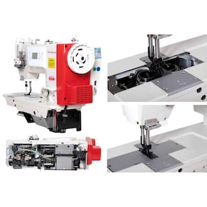 Máquina de costura industrial pespontadeira fixa transporte duplo para confecção de vestuário com tecidos leves e médios.