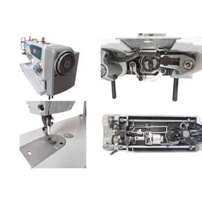Máquina de costura industrial reta para confeccção de vestuário com tecidos leves e médios.