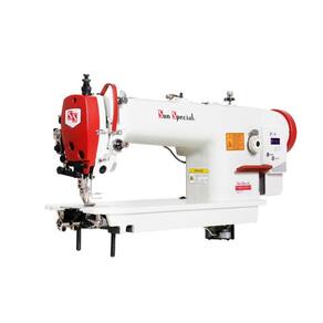 Máquina de costura industrial reta transporte duplo para confecção de vestuário com tecidos pesados.