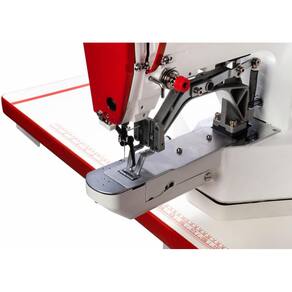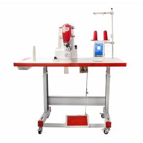 Máquina de costura industrial travete eletrônico para confecção de vestuário com tecidos médios e pesados.