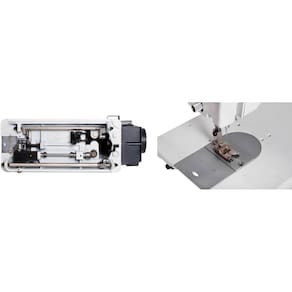 Máquina de costura industrial zigzag para confecção de vestuário com tecidos leves e médios.