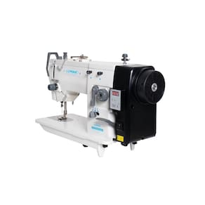 Máquina de costura industrial zigzag para confecção de vestuário com tecidos leves e médios.