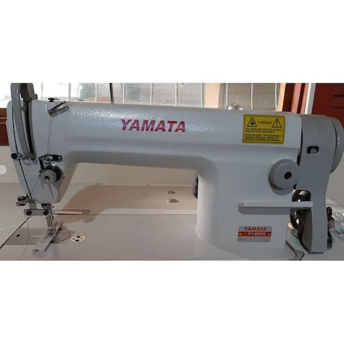 Máquina de costura Industrial Nova, Tipo Reta, Marca Yamata, uma agulha, 4500rpm, lubrificação automática, ponto até 5 mm, completa com conjunto de montagem composto por: tampo de madeira revestido em fórmica impermeável, estante de ferro, motor importado (silencioso) 1/2hp 110/220 v com chave de reversão de voltagem e velocidade e acessórios para manutenção.
