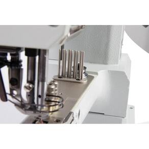 Máquina de costura transporte triplo de braço para confecção de vestuário com tecidos médios e pesados como couros e peles.