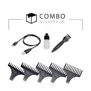 Com lâminas em aço inoxidável 440C, o equipamento proporciona maior durabilidade, resistência à corrosão e cortes mais suaves. Acompanha 5 pentes de encaixe para diferentes estilos e alturas de corte, além de escova de limpeza, óleo lubrificante e cabo USB.