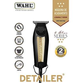 MÁQUINA ACABAMENTO WAHL DETAILER BIVOLT PRETA & DOURADA - Produto em estoque, envio imediato. - Motor com 5.000rpm, potente e silencioso. - Corte sem pente de 0.4mm, é menos de meio milímetro. - Leve isso ajuda a prevenir doenças nas articulações. - Cabo de energia de 2,90mt. - Lâminas cromada formato T-Wide. - Máquina original com Nota Fiscal. - Garantia de Fábrica de 2 anos. CARACTERÍSTICAS TÉCNICAS - Lâmina de aço inoxidável. - Motor Giratório Potente com 5.000 rpm. - Alimentação: Bivolt 110v e 220v - 24 meses de garantia. - Largura de corte: 40mm - Peso da Máquina: 371gr - Peso Total Caixa e Produtos: 598gr - EAN: 0043917996349 - Produto Nacional com Certificado INMETRO. ITENS - Máquina Wahl Detailer Bivolt Preta & Dourada - Óleo lubrificador. - Escova de limpeza. - Protetor de lâmina. - Kit com 03 Pentes Nº 0.5(1,5mm), 1.0(3mm), 1.5(4,5mm) - Manual de Instrução e Termo de Garantia.