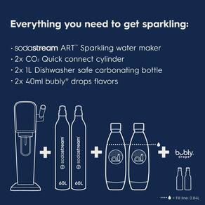 - Eleve o seu jogo de hidratação com o pacote SodaStream ART Sparkling Water Maker; transforme água da torneira comum em água com gás refrescante com um simples puxão de uma alavanca; ideal para criar bebidas gaseificadas para reuniões familiares ou momentos individuais de refresco