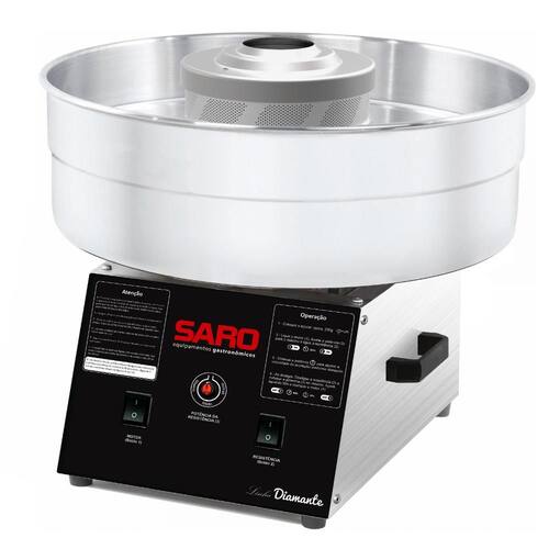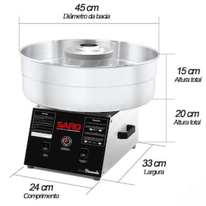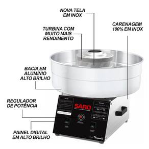 Máquina de algodão doce profissional com bacia de alumínio de 45cm de diâmetro. Possui regulador de potência, carenagem com revestimento epóxi anti-risco e a prova de ferrugem, e 4 pés emborrachados.Base antiderrapante