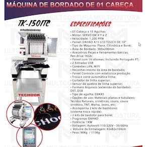 Especificações 01 cabeça 15 agulhas Motor: servo em x y e z Velocidade: 1.200 ppm Painel: dahao a15 lcd touch de 10 Tipo de máquina: plana, cilindrica e boné; Área de bordado: 360200mm Acessórios peças e ferramentas básicas, Pen drive 16gb; Painel com 19 idiomas; incluindo português pt; 2 entradas usb Conexões lan, wifi Reconhecimento da área de bordado; Painel controle com estatística produção Troca e corte automática linha; Cortador de linha superior; Sensor de quebra de linha superior; Formato arquivos extensão do bordado : Dst, dsb Tipo de agulha: dbkx5 Opções de uso: materiais planos e tubulares; Tecidos naturais, sintéticos, couro, couro sintético, tnt, malha, jeans, etc; Acompanha 2 kits de bastidores sistema troca rápida ; 2 kits de bastidor para boné; Programas dahao Potência: 1kw Voltagem: autovolt 110/220v - 50/60hz Volume da embalagem: 82x82x104cm Peso: 98kg / 115kg Homologação Anatel: 043581603030 Marca: Teckhook