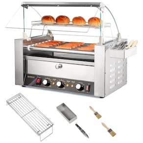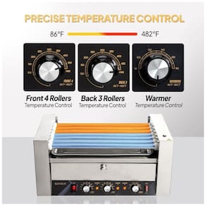 Os controles de temperatura dupla permitem ajustar a temperatura de cozimento para os rolos dianteiros e traseiros, com uma faixa de operação entre 30°C e 250°C (86°F a 482°F) e uma faixa de temperatura para o aquecedor de pães entre 30°C e 85°C (86°F a 185°F). A rotação lenta dos rolos assegura que os cachorros-quentes sejam cozidos uniformemente, mantendo o sabor suculento.