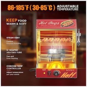 O Steamer de Cachorro-Quente ROVSUN é perfeito para uso diário e comercial. Feito de aço inoxidável, garante segurança alimentar e protege sua saúde. Com bandejas removíveis para facilitar a exposição dos alimentos e limpeza. Possui um tanque de água com saídas ajustáveis, permitindo controlar facilmente a umidade interna. A temperatura pode ser ajustada entre 30°C e 85°C, mantendo os cachorros-quentes quentes e suculentos conforme sua preferência. Feito em aço inoxidável, durável e à prova de corrosão, o sistema de vaporização possui vidro temperado para operação segura, um tanque de água com saídas ajustáveis para controle da umidade, prateleiras removíveis para exposição dos alimentos e limpeza fácil, controle simples em um painel, e temperatura ajustável de 30°C a 85°C. Com capacidade para 175 cachorros-quentes e 40 pães, é ideal para festas, stands de comida e eventos. Leve agora mesmo e garanta cachorros-quentes sempre frescos e prontos para servir!