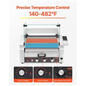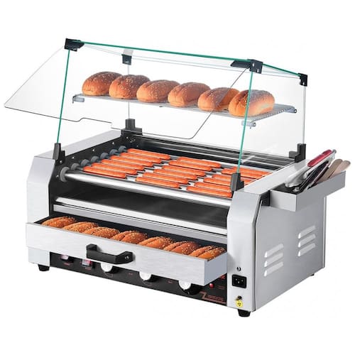 Asse como um profissional! A nossa máquina de cachorro-quente possui um grill em aço inoxidável de qualidade comercial. É a escolha ideal para barracas de comida, festas familiares e churrascos. Projetada para diferentes tipos de cachorros-quentes, salsichas, almôndegas, etc. Controle preciso de temperatura, podendo ajustar a temperatura de cozimento até 250°C separadamente para os rolos da frente e de trás. Construída com uma estrutura durável em aço inoxidável, esta máquina proporciona não apenas um visual moderno, mas também um desempenho duradouro. A tampa de vidro bloqueia sujeira e mantém os alimentos aquecidos, reduzindo o tempo de cozimento. A bandeja removível mantém sua cozinha limpa e facilita a limpeza. Os rolos podem girar 360° para cozinhar os alimentos de forma uniforme, enquanto o motor potente oferece um cozimento altamente eficiente. Detalhes íntimos incluem um aquecedor de pães para até 18 unidades, e a caixa de armazenamento oferece espaço conveniente para pincéis, clipes, espetos ou luvas, ajudando a economizar espaço no balcão e manter sua cozinha organizada.