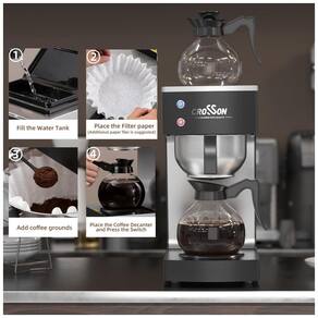 O funil 304 SS permite o contato total entre a água quente e os grãos de café, resultando em uma extração de sabor ideal entre 90 e 96 graus C. Este sistema de preparo de café é eficiente e pode preparar um bule cheio em apenas 7 a 8 minutos. Com capacidade para 24 xícaras de 3,6L, possui duas garrafas de vidro equipadas, cada uma com 12 xícaras. Além disso, possui aquecedores superiores e inferiores, e 2 decantadores de café preparado sempre em espera, garantindo que o cliente nunca precise esperar. A experiência de café premium é livre de impressões digitais e sem preocupações de limpeza. O botão Brew e ON OFF com indicador integrado torna o processo rápido e fácil de usar, permitindo que até mesmo iniciantes possam preparar café premium em minutos.