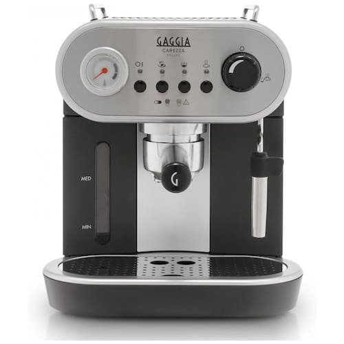 Máquina de café expresso em casa A Gaggia Carezza é uma compacta máquina de café expresso e semiautomática com uma estética retrô. Uma configuração simples de botão, um porta filtro pressurizado e uma varinha de pannarello com espuma automática eliminam as suposições ao fazer um bom café expresso, latte ou cappuccino. Prepare seus cafés pré moídos favoritos e cápsulas ESE para uma bebida deliciosa sem o incômodo de moer seus próprios grãos. Remova a varinha Pannarello e use a varinha de aço inoxidável por baixo para criar microespuma e latte art mais firmes.