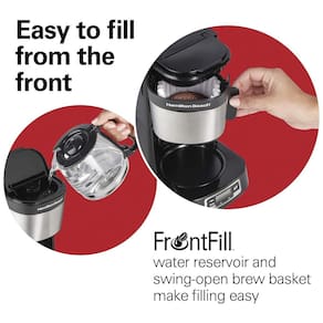 FÁCIL DE ENCHER PELA FRENTE: O reservatório de água FrontFill e o cesto de preparo giratório são projetados para fácil acesso sob os armários, facilitando a adição de água e pó de café à cafeteira. O design também reduz derramamentos e bagunça na bancada.