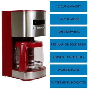 Tipo de Cafeteira: Máquina de café filtrado (Drip Coffee Machine) Cor: Vermelha Dimensões do produto: 23,6 x 16,5 x 34,3 cm Peso do item: 2,5 kg Capacidade: Prepara até 1,8 L de café (aproximadamente 12 xícaras) Funções Especiais: Timer programável, filtro de água, e filtro reutilizável para economia e sustentabilidade Modo de Operação: Totalmente automático Componentes Incluídos: Filtro e jarra Modelo: KKCM12R AZ Número de Itens: 1 Marca: Não Informado