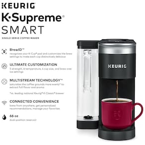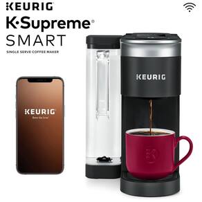 A Keurig KSupreme SMART é uma máquina de café conectada ao WiFi por meio do aplicativo Keurig. Com a tecnologia BrewID, a máquina reconhece a marca e a torra da cápsula KCup para personalizar automaticamente as configurações de preparo de acordo com as recomendações dos especialistas em café que a criaram, resultando em um café delicioso e cheio de sabor. Além disso, é possível ajustar a intensidade, temperatura e tamanho da xícara, salvando até 10 configurações personalizadas no smartphone. A máquina também possui a tecnologia Multistream, que satura o solo de maneira uniforme para extrair todo o sabor e aroma. É possível preparar café quente sobre gelo para obter um café gelado delicioso e cheio de sabor, além de ser compatível com o filtro de café reutilizável universal My Kcup. A máquina é compatível com iOS 13 e superior e Android 8 e superior e funciona em redes WiFi domésticas de 2,4 GHz usando segurança WPA2PSK. O reservatório de dualposição permite preparar até nove xícaras antes de reabastecer e é amigável com canecas de viagem de até 7 polegadas de altura. O aplicativo Keurig permite preparar café de qualquer lugar, agendar, personalizar suas configurações, criar e salvar configurações favoritas e usar o Voice Assist para preparar remotamente. Também funciona com o SMART Delivery para gerenciar sua despensa enquanto você prepara, para que você nunca fique sem seus pods KCup favoritos.