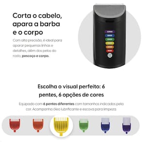 Conteúdo da Embalagem: 01 Máquina de cortar cabelo e barba 06 Pentes coloridos 01 Óleo lubrificante para manutenção 01 Escova para limpeza 01 Carregador tipo USB C 01 Manual do Usuário