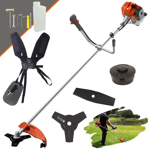 Com guidão ergonômico lateral, permite um alcance amplo e maior mobilidade, capaz de aumentar a produtividade diária. Possui motor 2 tempos á gasolina, de 42,7 Cilindradas (43cc) 9.000 de rotação 1,7HP de potência que proporcionam maior performance e economia na operação.Seu conjunto de acessórios inclui kit de ferramentas, cinto de suporte duplo almofadado, carretel de nylon e lâmina de corte 3 pontas.